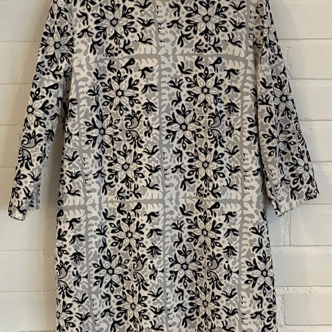 Uusi, käyttämätön (koko ei sopiva). Väri: pohja tumma vihreä jossa musta kuvio (kivet). Mitat: k-k n. 52 cm, O-h n. 93 cm, hiha n. 47 cm. Mekossa vuori ja taskut, materiaali 100% puuvilla.