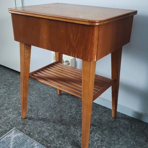 Vintage (v.1984) tukeva mäntyinen yöpöytä/sivupöytä laatikolla ja alatasolla, siistikuntoinen.