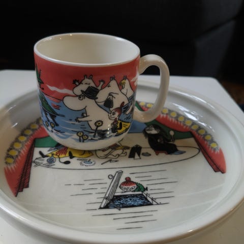 Myydään muumi lastenastiasto Vaarallinen juhannus. Lautasessa ohuita naarmuja. Mukissa pari pientä valkoista kulumaa, (ks. kuvat) muuten kuin uusi. Astiasto on täysin ehjä.