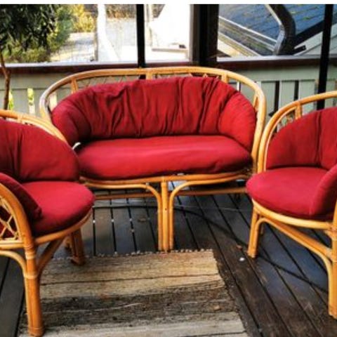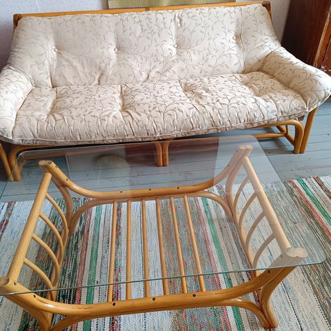 Myydään hyväkuntoinen ja jämäkkä rottinkisohva , nojatuolit sekä lasipöytä. Myydään vain kokonaisuutena!