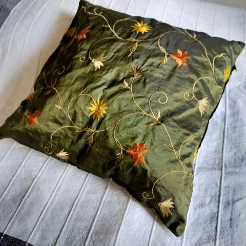 Ruskea aplikoitu sisustustyynyn päällinen 100% silkkiä. Toinen puoli sileä. Vetoketjullinen, mutta vetimen haka katkennut (viimeinen kuva). Koko 40x40 cm.