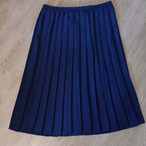 Puolihame tummansinisillä palloilla, kokomerkintä 42. Vetoketju ja nappi, lisäksi solmittava vyö. Vyötärö ei jousta, leveys n. 41 cm. Tainnut jäädä kokonaan käyttämättä, uudenveroinen vähintään.