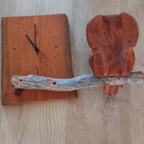 Vanerista käsin tekemäni kello. Molemmat puolet ovat samanlaiset(ei identtiset)hiljainen koneisto. Läpimitta n.33cm