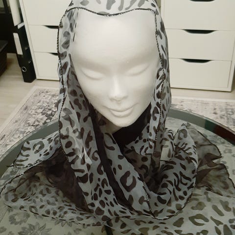 Hyväkuntoinen silkkisen pehmeä leopardihuivi 55x 55cm. 5e.