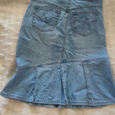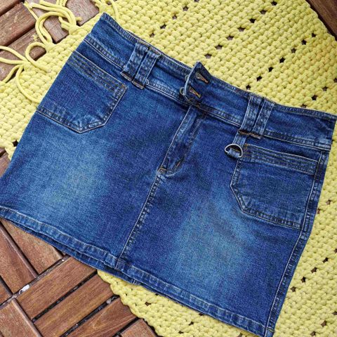 Moitteettomassa kunnossa oleva farkkuhame. Ei taskuja, niitteejä edessä, yksi (ensimmäinen) niitti tippunut. Kuminauhavyötärö.
