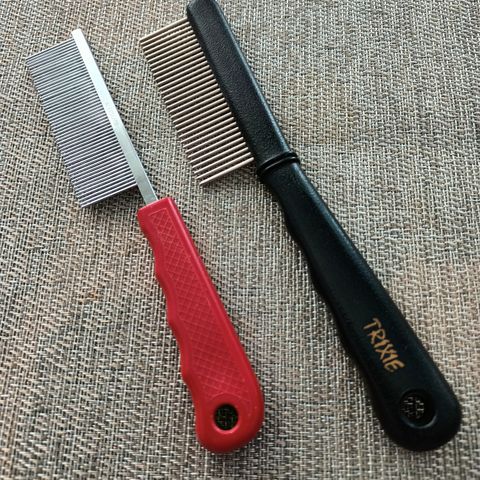 Kampa koiralle. Leveämpi ja kampeampi osa. Metalinen. Varsi puuta