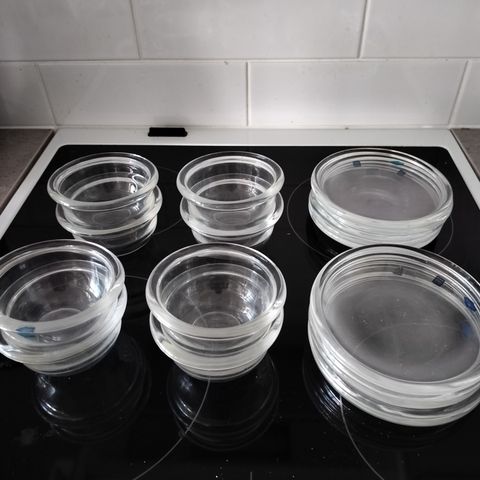 4 jälkiruokakulhoa ja 1 tarjoilukulho. Jälkiruokakulhon halkaisija 11 cm ja tarjoilukulhon halkaisija 20 cm.