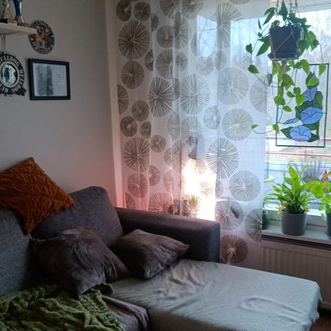 Sohvan päällisenä ollut, nyt osiin ratkottu, vahva kangas. Ostettu Iskusta aikoinaan. Siisti kunto. Keksiikö joku paloille vielä käyttöä? Matonkuteiksi?