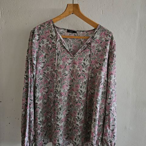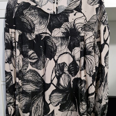 Naisten musta Sara-pusero upealla kuosilla. Kauniissa puserossa on kantattu pyöreä pääntie, jossa on edessä halkio nauhakiinnityksellä. Puserossa on täyspitkät hihat, jotka poimuttuvat hihansuun leveän nappikalvosimen yläpuolelle. Materiaali on kauniisti laskeutuvaa twillisidoksista viskoosikangasta. Materiaalille on ominaista 3-5% kutistuminen ensimmäisessä pesussa.