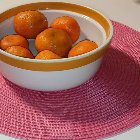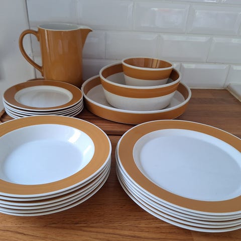 Design Kaarina Aho, tuotannossa 1964 - 1974. Tarjolla mallin FC astioita Aprikoosi-koristeella (jota myös Palapeliksi kutsutaan). 6kkp tassineen, tarjoilulautanen. Retro nätti ja kodikas setti.