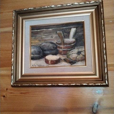 maalaus, joka esittää kylämaisemaa taloineen ja vesipyörällä varustetulla rakennuksella meren tai suuren vesistön äärellä. Maalauksen tyyli viittaa perinteiseen maisemamaalaukseen). Kehysten sisämitta 10*14. Yhteishinta.