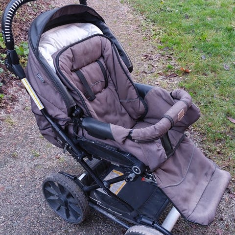 Tummansiniset paljon käytössä olleet rattaat ja vaunut. Rattaiden sininen päällinen ei ole meillä ollut ollenkaan käytössä, vaan 10. Kuvassa näkyvä valkoruskea päällinen, jonka saa myös halutessaan mukaan, mutta sen kunto on huonompi kuin sinisten. Lisäksi mukaan saa rattaisiin kuuluvan tuulenpitävän jalkapeitteen.