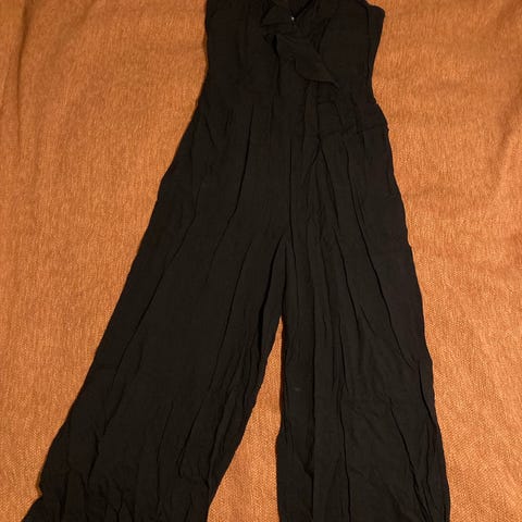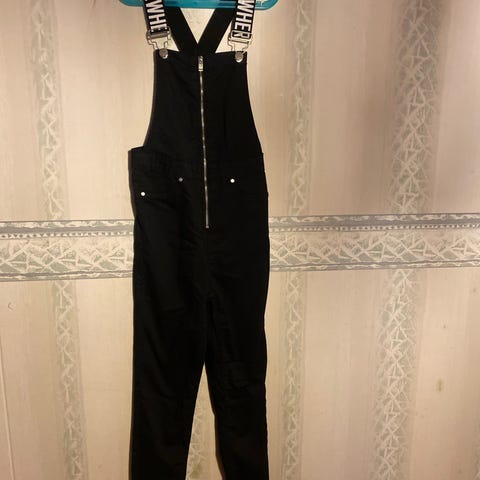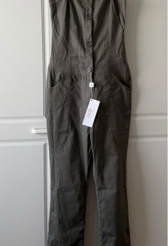 Mangon farkkuhaalari. Edessä napit ja alhaalla vetskari. Useita taskuja.