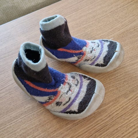 Myydään vähälle käytölle jääneet keltaiset sukkakengät / "paljasjalkakengät", joissa kumipohja. Kokomerkintänä 26/27, mutta sanoisin että vastaa enemmän kokoa 23/24 (pohjallisen pituus noin 14,5 cm). Kaikinpuolin ehjät, mutta eivät enää uutukaisen puhtaat.