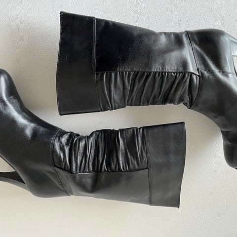 Tässä mittoja: ulkopohjan pituus linnuntietä mitaten n. 23,8 cm, ulkopohjan leveys leveimmältä kohtaa n. 8 cm, saappaiden korkeus n. 18 cm, varren suuaukon ympärysmitta n. 31 cm, koron korkeus on n. 3 cm.