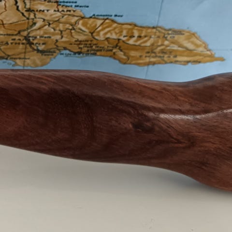 Tarkka kopio tiikkikahvalla ja näyttävällä, pitkällä 38,5cm olemuksellaan. Ja on jämäkkä, painava veitsi.