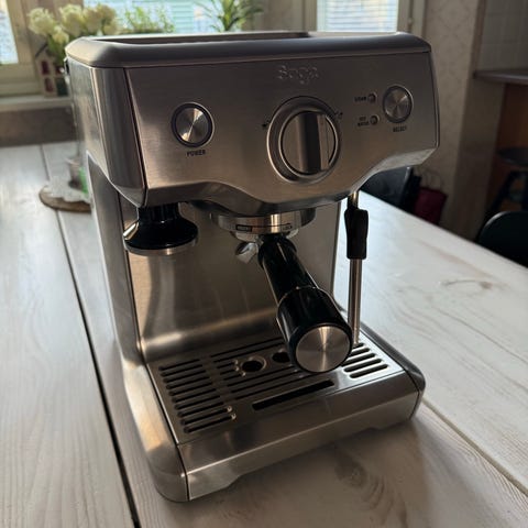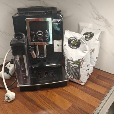 Täysin uusi ammattitason kahvinkeittovälineisto, joka sisältää pannun, digitaalisen vaa'an ja käsimyllyn.