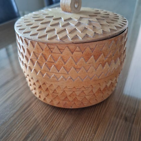 Kauniisti koristeltu tuohirasia. Luultavasti venäläinen. Upeaa käsityötä.