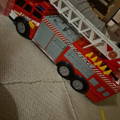 Kiva lelu. Sivusta olevista kahdesta napista kuuluu molemmista omanlaiset äänimerkit. Auto vilkuttaa niistä myös valoja ja takarenkaat alkavat pyöriä. Toimii pattereilla.