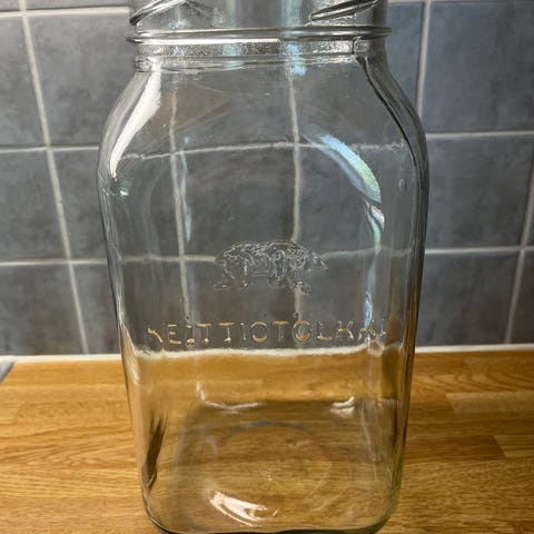 Kuvanmukainen täysin ehjä Karhulan lasin kahden litran Karhu keittiötölkki 5,-