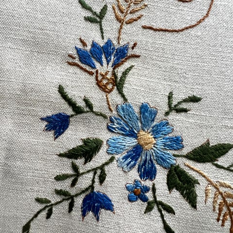 Kuvan mukainen pöytäliina. Pitsiä ja kirjailuja. Pitsi harmaata, liina luonnonvalkoista puuvillaa. Mukaan tulee kuusi lautasliinaa.