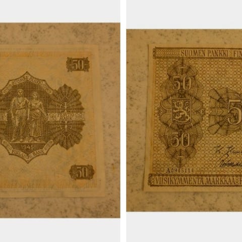 Kuvien mukainen 50 mk seteli, v. 1945, h. 25,-