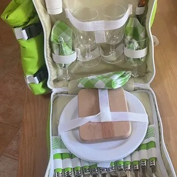 Kuin uusi piknik reppu. Mukana 4 hengen astiasto, viinipullon cooleri, kankainen frisbee, minipetanque ja paketti servettejä. Repun selkäosassa on eristetty kylmätila, eväät säilyy hyvin kylmänä. Viinipullon coolerin saa tarrranauhalla kiinni repun sivulle. Edessä tilava tasku.