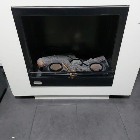 Mustaksi maalattu koriste takka. Takassa toimii tuli toiminto nappia painamalla mutta lämpöä tuova ominaisuus ei pelitä jostain syystä.