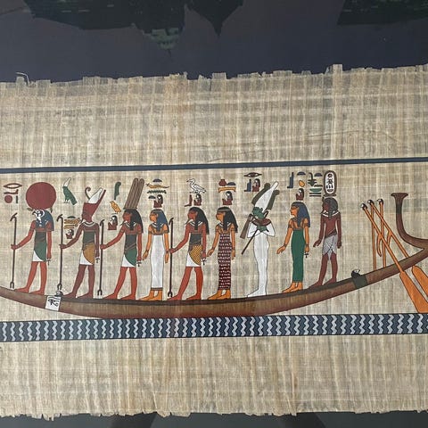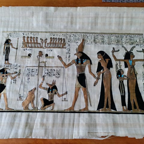 Ihastuttava vanha papyrus signeerauksella, The Mongoose. Korkeus noin 29,5cm, leveys 21cm. Kleopatra.