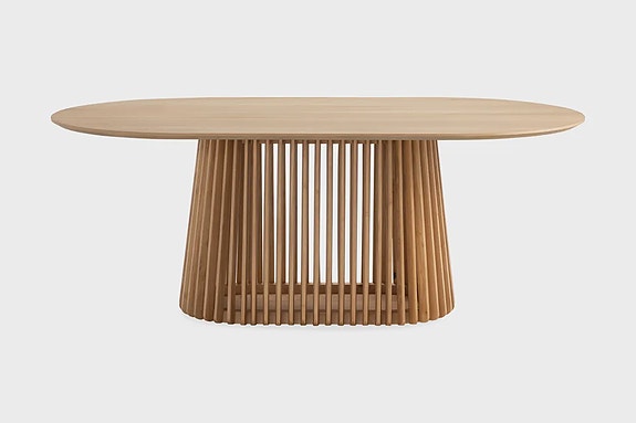 Dan-Formin ovaali Ooid-pöytä. Elegantin pöydän pöytälevyssä on viistetty reuna ja pöydän neljä jalkaa on yhdistetty ristikkomaisen tukirakenteen avulla. Yhdistä pöytään modernit ruokapöydän tuolit, jolloin ruokailutilan yhtenäinen tyyli on taattu. Valmistusmateriaaleina saarnivaneri ja metalli.