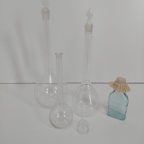 Hienoja erikokoisia vanhoja lääkepulloja.