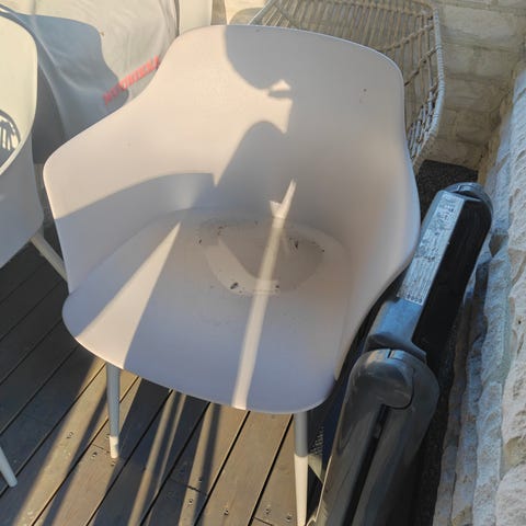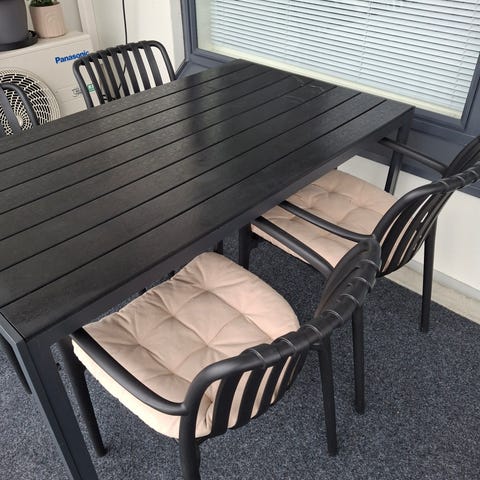 Kaunis ja todella kestävä neljän hengen ruokailuryhmä ulos. Helppohoitoinen. Siistissä kunnossa, pöydän pinnassa jotain pieniä jälkiä mutta yleisilme siisti. Pöydän pituus n. 159 cm ja leveys 89 cm.
