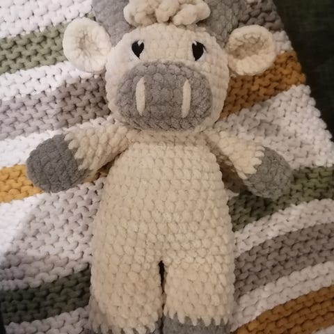 Virkkaamalla tehty pehmo, korkeus noin 35 cm, pään leveys nopin 16 cm. Materiaalina polyesterilanka ja täytteenä askarteluvanu, nenä villalankaa. Täytevanu pesun kestävää. Postikulu ilman toridiiliä 8,90 e.