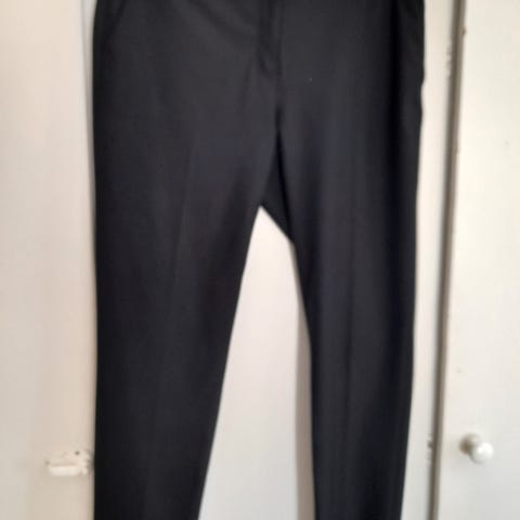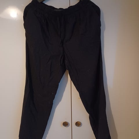 Mustat kivat housut jossa on 55% pellavaa, on kivan tuntuiset päällä. Koko on 44 ja vyötärö on 96 cm, pituus on 96 cm ja lahkeen leveys on 26 cm. Housuissa on taskut sekä edessä että takana.