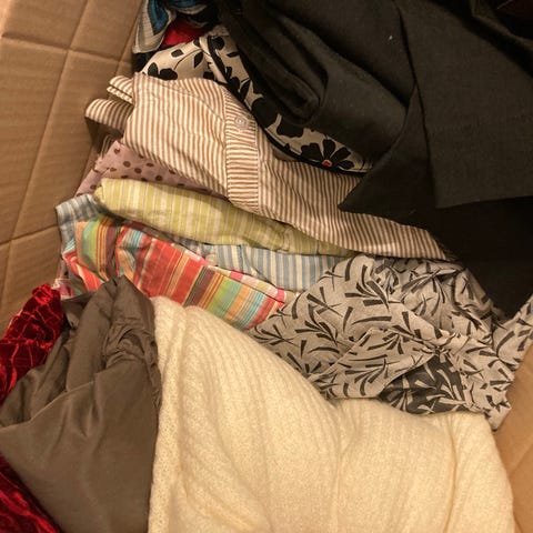 Kuvannäköiset vaatteet, osaa käytetty ja nämä pesty, ei silitetty. Nukkaa ja värikulumaa voi olla. Kunto tyydyttävä-uusi, kaikki vaatteet käyttökelpoisia kuitenkin. Vaatteet voi olla ryppyisiä säilytyksestä. Koot vaihtelee 40, 42 ja L välillä. Vaatteista 22 on uusia, joissain on vielä laput tallella. 13 vaatetta on käytetty, osaa pari kertaa. Kaikissa ei ole kokolappua mukana, mutta kaikki vaatteet ovat näiden kokojen välillä. Savuton ja eläimetön koti. Nouto tai posti. En tee toridiiliä.