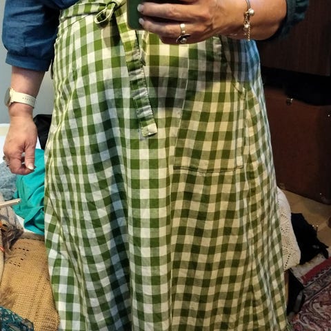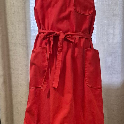 Kotimainen pitkä essumekko. 100% puuvillaa. Koko 40. Valmistaja: Henrica & Henric Porin painotekstiili. Punaisella pohjalla vihreitä, keltaisia ja valkoisia neliöitä. Sivutaskut.