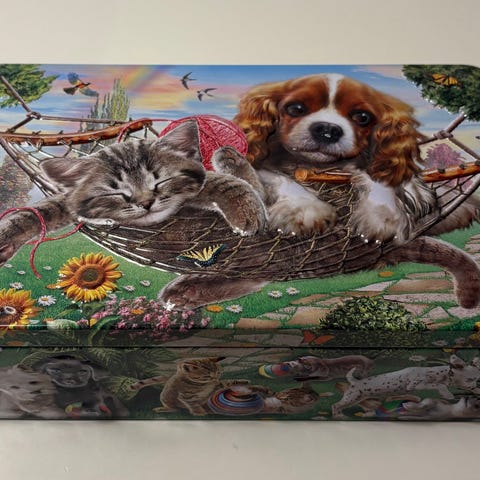 Cat pattern and floral 70s 80s type patterned colourful vintage metal tin