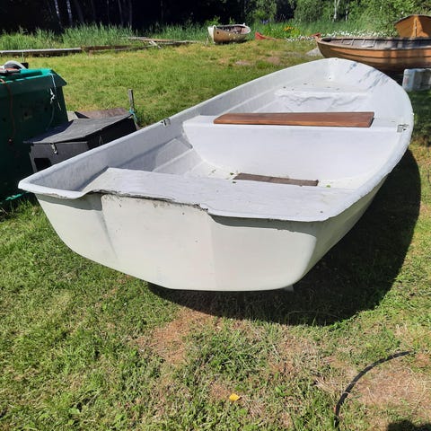 Terhi 245 jolla jonka pituus on 245 cm ja leveys 135 cm. Pohjassa sisäpuolella viimeisessä kuvassa näkyviä naarmuja. Penkkejä ei tällä hetkellä ole mutta airot on ja ne saa jollan mukana. Hinta 380 e.