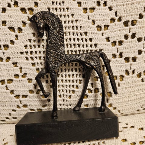 Kuvatunlainen hevospatsas jalustalla korkeus 34 cm ja pituus noin 25 cm.