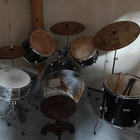 Mukana myös REMOn Dynamax -haikka ja sen Paiste 200 pellit (Made in W.Germany...)