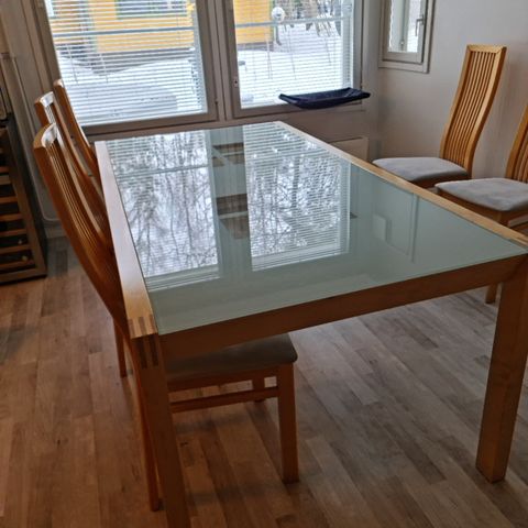 Sisustusliike Zazan Neutra -ruokapöytä on persoonallinen ja tyylikäs valinta ruokailutilaan. Pöytään on teetetty mittatilaustyönä uusi karkaistu lasikansi, jonka savunharmaa sävy ja kiiltoreunahiotut reunat tuovat modernia ilmettä. Lasilevyn koko on 135 x 85 cm, joten pöydän ääreen mahtuu mukavasti kuusi henkilöä. Pöydän muoto on säilytetty alkuperäisenä, ja lasilevyn on valmistanut Helsingin Lasi ja Puu. Neutra-pöytä yhdistää uniikin muotoilun ja laadukkaat materiaalit — täydellinen ratkaisu skandinaaviseen ja persoonalliseen sisustukseen.