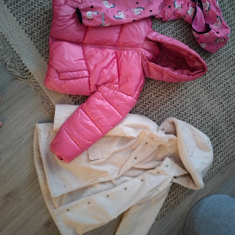 Vaatteet hyvässä kunnossa, ei reikiä. Violetti talvihaalari 10 €,vaaleanpunainen keväthaalari 10€ talvitakki 10€. Kaikki kolme yhteensä 25 euroa.Noudettavissa keskustasta.