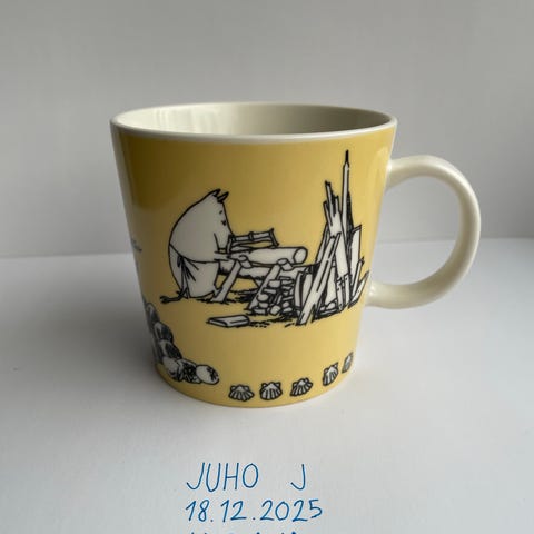 Myydään keltainen 90-luvun muumimuki. Muki on muuten ehjä ja lasite kiiltävä, mutta mukin reunassa pieni rikko. Näkyy kuvissa.