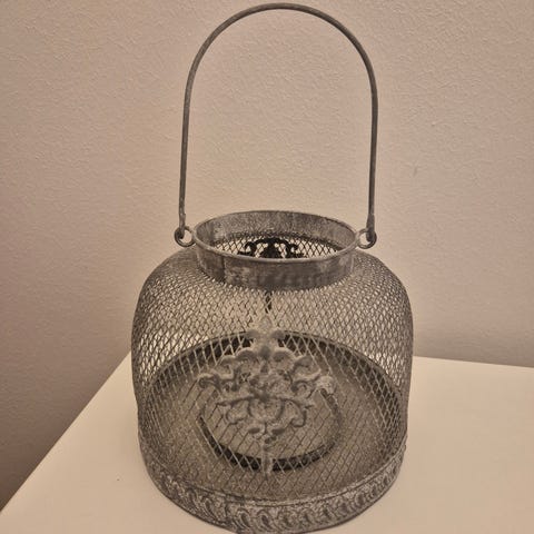 Lasinen kynttilälyhty, ’pullo’ jossa pohja auki, sisällä tuikkukynttilän pidike, metallinen ripustusketju.