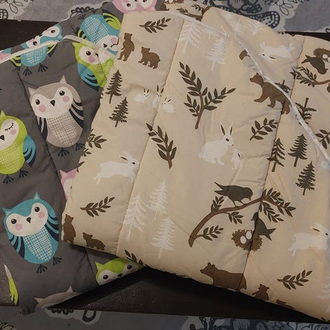Kaksi äitiyspakkaus makuupussia / täkkipussia. Ollut jaossa -86 ,-87 ja - 88 äp:ssa. Toinen lähes kuin uusi; muhkea, narut tallella ja ehjä. Toisessa, verraten tähän äskeisen, ehkä hieman vaaleampi väri ja rattaat tehneet yhteen kohtaan pieniä nuppineulanpään kokoisia reikiä, eivät oikein näy kuin läheltä. Ja tästä käytetymmästä.puuttuu nauhat.