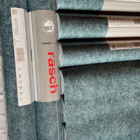 15 avaamatonta ja 1 avattu rulla Rasch textil-tapettia. Tässä on kahta eri erää (10+5, silmämääräisesti eroa ei havaitse, mutta kannattanee laittaa eri seinille eri erät.