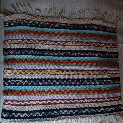 Mummon omilla kangaspuillaan kutoma jämäkkä retro nukkamatto, tehty selvästi valoverhoista ja pitsiverhoista