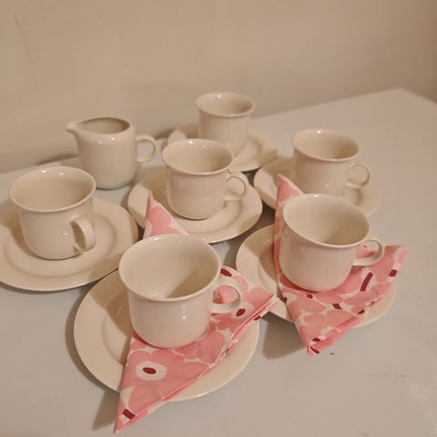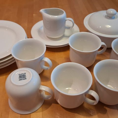 Myydään ylimääräisenä kuin uudet Arabia Arctica kahviastiastot aluslautasineen (15kpl) ja 2kpl samassa sarjassa olevia teekuppeja. 2 isoa tarjoiluastiaa (soikea ja pyöreä), sokerikko ja kermakko.