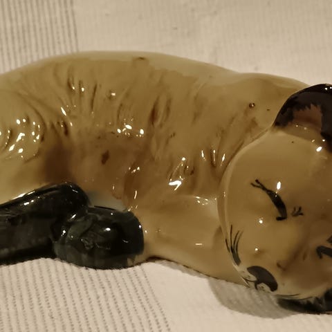 Suloinen mini posliinikissa. Pituus 3,5 cm, leveys 2 cm ja korkeus 1,5 cm.