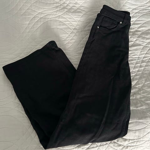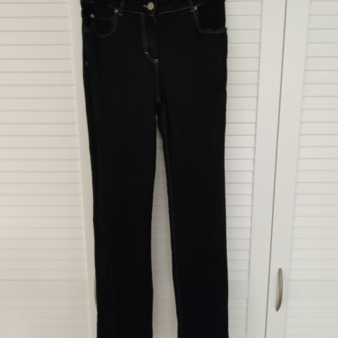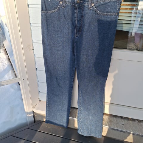 Venyy enemmän kuin normaali stretch mutta en saa selvää prosenteista. Puuvillaa, polyesteri ja elastaani. Sisäpituus 65 cm ja vyötärö 80 cm.